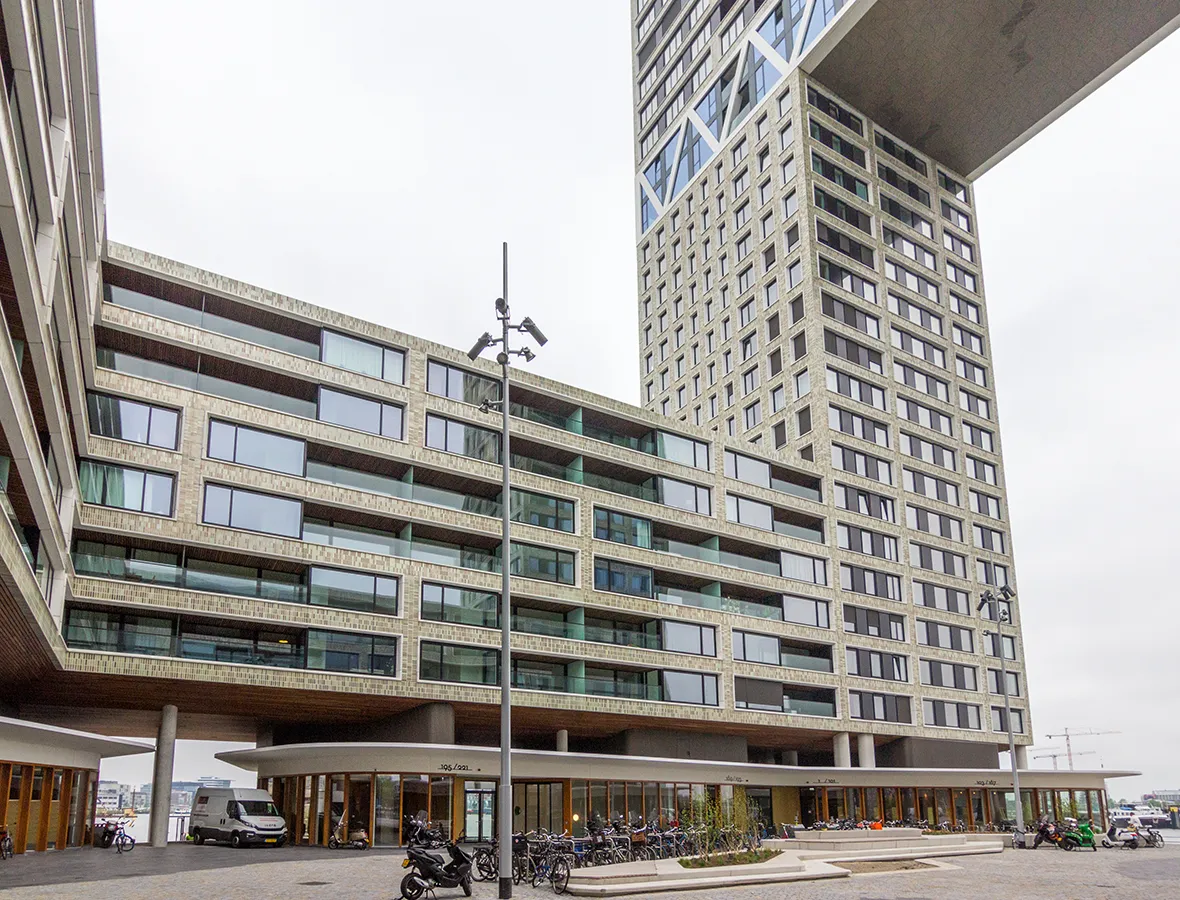Daarnaast is het gebouwvolume 7 meter opgetild, hierdoor is ruimte ontstaan voor horecapaviljoens op de begane grond. Dankzij de 6 verschillende tinten geglazuurd baksteen kleurt het gebouw mee met het weer en water rondom het gebouw.